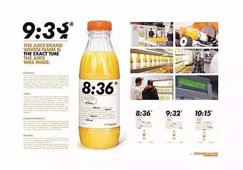 为了体现果汁新鲜程度,超市直接在瓶子的包装上贴上了果汁的榨出时间,精确到分钟。因为每一瓶的榨汁时间都不同,所以他们的包装也都不一样,可以说每瓶都有独一无二的标签。于是这瓶柳橙汁开始了逆袭,从最初的无人问津,到为超市增加了足足25%的来客数。