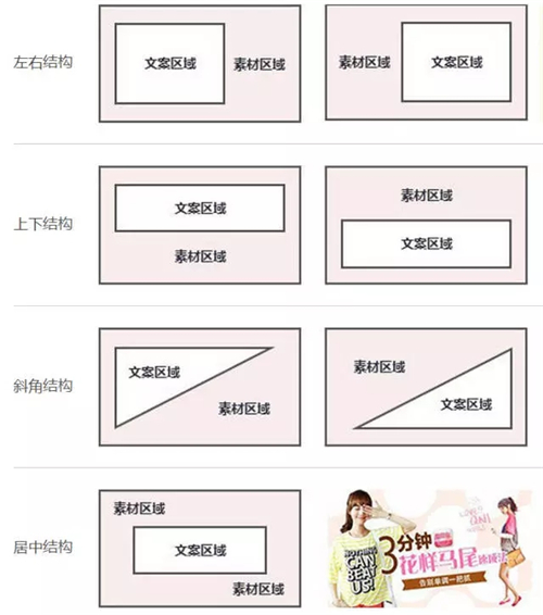 在开始设计之前,请根据相应的行业特征以及想要的广告表现手法,整理并确定对应的广告文案及展现内容。在完成准备工作后就可以开始设计了,我们这里介绍的设计方法主要分为五个步骤,分别是构图、色彩、背景、素材、字体。