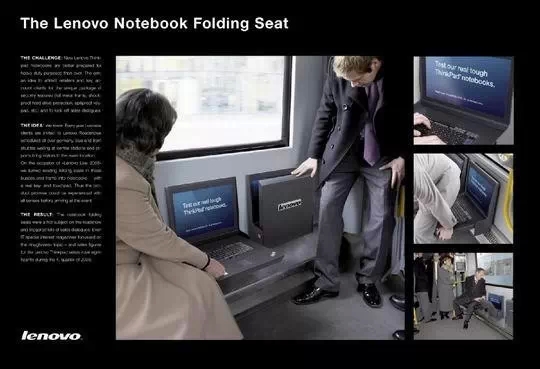 据悉,这是德国广告代理机构Ogilvy Frankfurt所提出的创意,联想在中心车站、飞机场等候的巴士、有轨电车上都安装了这么几个折叠座椅,在将客户带往会场的同时让他们体验一番ThinkPad的全金属外壳、防冲击硬盘?;?、防水键盘等安全特性。当然你也可以蹲下来用它们上个网什么的,累了就坐下休息。只是,不要坐太久了,小心烫着。