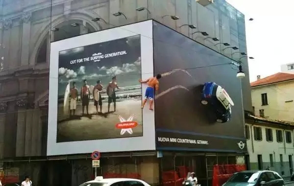 Mini Cooper为宣传新推出的Countryman,新近制作了一个户外广告,在建筑的一面墙上放置了一个虚构冲浪板品牌Malamalama广告,另一面则是一辆垂直吊起的Mini Cooper Countryman,建筑的转角处放置一个假人,正跨过边界窥探该车。
