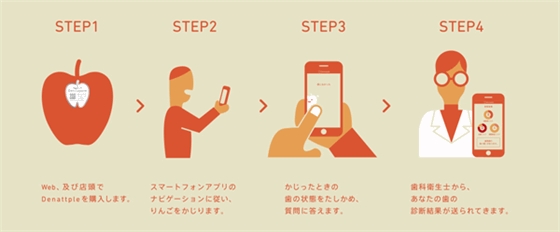首先,通过互联网或线下店面购买“Dentapple”,然后用智能手机扫描苹果上贴着的二维码,安装名为“Dentapple”的APP。接下来,按照程序指示,咬一口苹果。然后根据咬苹果时牙齿、牙根的感觉、齿痕的形状等,回答程序提出的问题并提交。1天之内,就会收到专业牙医的建议。当然,200日元(约10.7元人民币)一个的苹果,只做测试可惜了,剩下的也要吃完,应用开发者特意选择的长野县的富士苹果据说很美味。