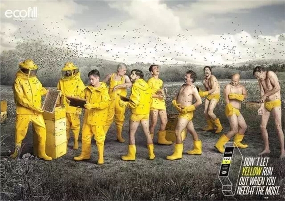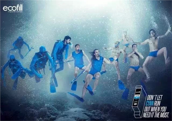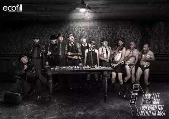 如果你以为这是服装品牌或者公益广告,那就大错特错啦!这一组图片是奥美哥伦比亚为墨盒品牌Ecofill打造的一组独特广告。广告中,形形色色的人物被放置在不同场景中,我们可以看见他们的衣服从无到有的搞笑状态。而这些青色、洋红、黄色和黑色的衣服则代表了不同颜色的墨水,也揭示了这则创意广告的主题:记得给你的打印机添加油墨!否则,关键时刻掉链子,后果可是很严重的哦!